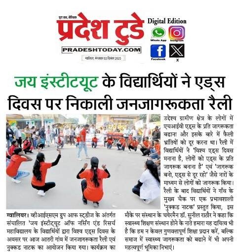 व्हीआईएसएम ग्रुप आॅफ स्ट्डीज़ के अंतर्गत संचालित ’जय इंस्टीट्यूट ऑफ नर्सिंग एंड रिसर्च महाविद्यालय के विद्यार्थियों द्वारा विश्व एड्स दिवस के अवसर पर आज आतरी गाँव में जनजागरूकता रैली एवं नुक्कड नाटक का आयोजन किया गया। कार्यक्रम का उद्देश्य ग्रामीण क्षेत्र के लोगों में एचआईवी एड्स के प्रति जागरूकता बढाना और इसके बारे में फैली भ्रांतियों को दूर करना था।