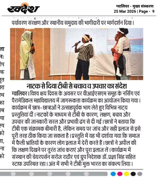 आज व्हीआईएसएम ग्रुप आफ स्ट्डीज़ के अंतर्गत संचालित नर्सिंग एवं पैरामेडिकल महाविद्यालय में विश्व क्षय रोग दिवस के अवसर पर एक भव्य जागरूकता कार्यक्रम आयोजित किया गया। कार्यक्रम का मुख्य उद्देश्य टीबी (क्षय रोग) के प्रति लोगों में जागरूकता फैलाना और इसके समय पर उपचार के महत्व को समझाना था। कार्यक्रम की शुरूआत मां सरस्वती के पूजन से हुई। इस अवसर पर कॉलेज के छात्र-छात्राओं ने उत्साहपूर्वक भाग लिया। कार्यक्रम में नर्सिंग एवं पैरामेडीकल के विद्यार्थियों द्वारा अलग- अलग नाट्यों की प्रस्तुति दी गई। नाटक के माध्यम से विद्यार्थियों ने टीबी के कारण, लक्षण, बचाव और उपचार के बारे में सरल और प्रभावी तरीके से जानकारी दी।