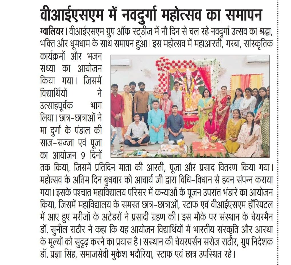 वीआईएसएम ग्रुप ऑफ स्ट्डीज में नौ दिन से चल रहे नवदुर्गा उत्सव का श्रद्धा, भक्ति और धूमधाम के साथ समापन हुआ। इस महोत्सव में महाआरती, गरबा, सांस्कृतिक कार्यक्रमों और भजन संध्या का आयोजन किया गया।