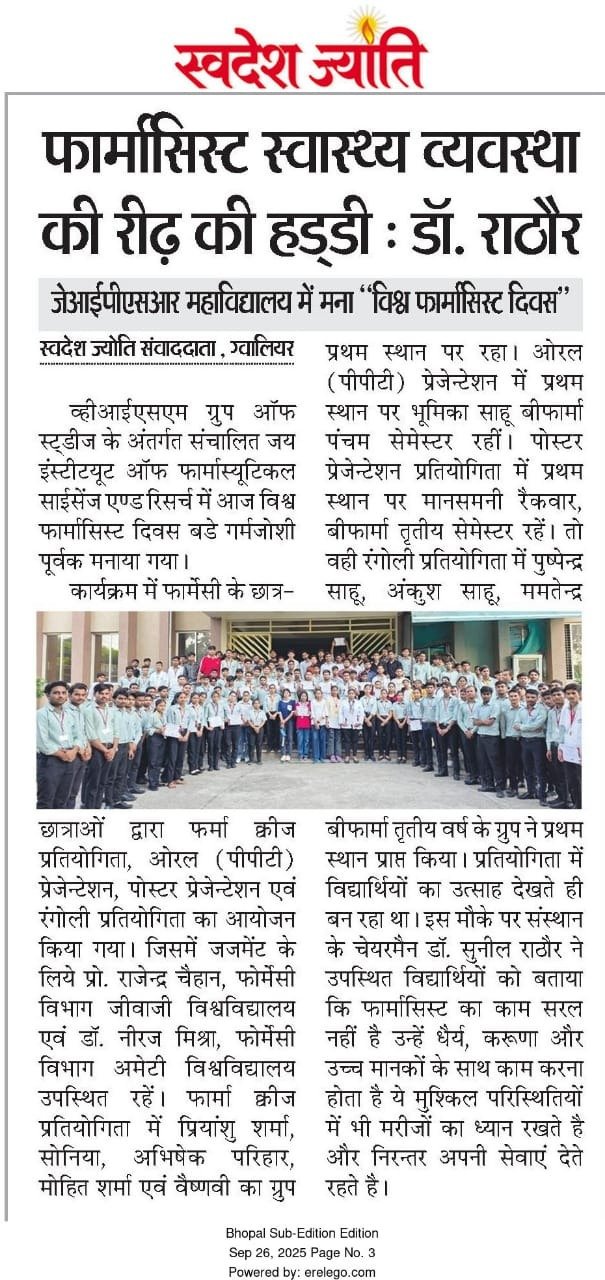 व्हीआईएसएम ग्रुप ऑफ स्ट्डीज के अंतर्गत संचालित जय इंस्टीट्यूट ऑफ फार्मास्यूटिकल साईसेंज एण्ड रिसर्च में आज विश्व फार्मासिस्ट दिवस बडे गर्मजोशी पूर्वक मनाया गया। कार्यक्रम में फामेर्सी के छात्र-छात्राओं द्वारा फर्मा क्वीज प्रतियोगिता, ओरल (पीपीटी) प्रेजेन्टेशन, पोस्टर प्रेजेन्टेशन एवं रंगोली प्रतियोगिता का आयोजन किया गया।